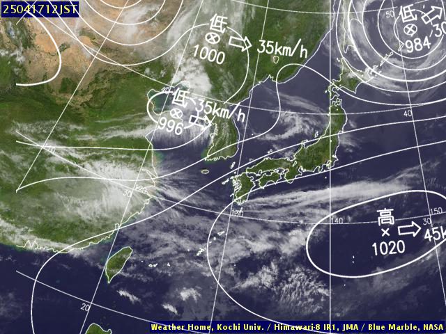 | 地上(高知大学気象情報頁赤外画像と気象庁速報天気図を合成) | |||