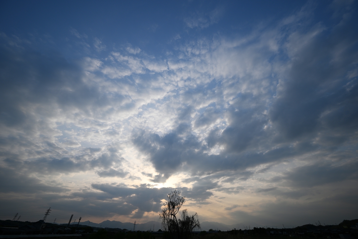 | 日本海を温帯低気圧が通過しましたが、はるか南の 海上(北緯25°付近)で東西に延びる停滞前線に 伴う上層雲が、朝から午後までかかり、多くの時間 帯で22°ハロが継続して見られました。 夕方、高積雲と層積雲の境界のような雲が鈴鹿 山脈の山麓に広がり、くすみがちだった空で、 しらしらと美しく輝きました。 |
