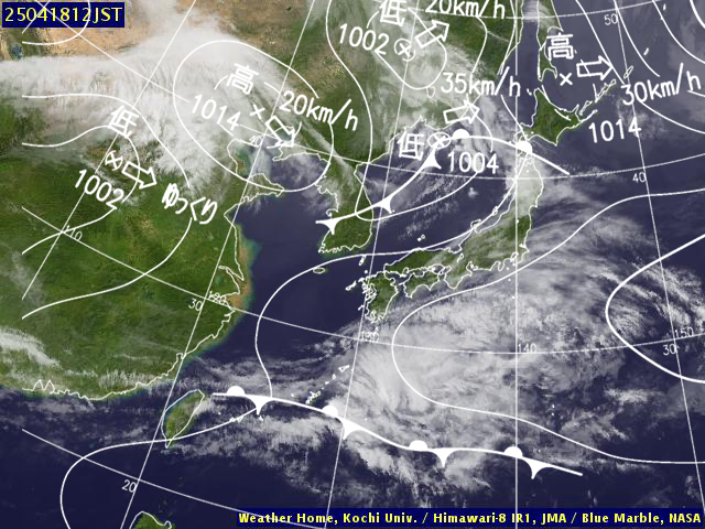 | 地上(高知大学気象情報頁赤外画像と気象庁速報天気図を合成) | |||