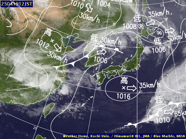 | 地上(高知大学気象情報頁赤外画像と気象庁速報天気図を合成) | |||