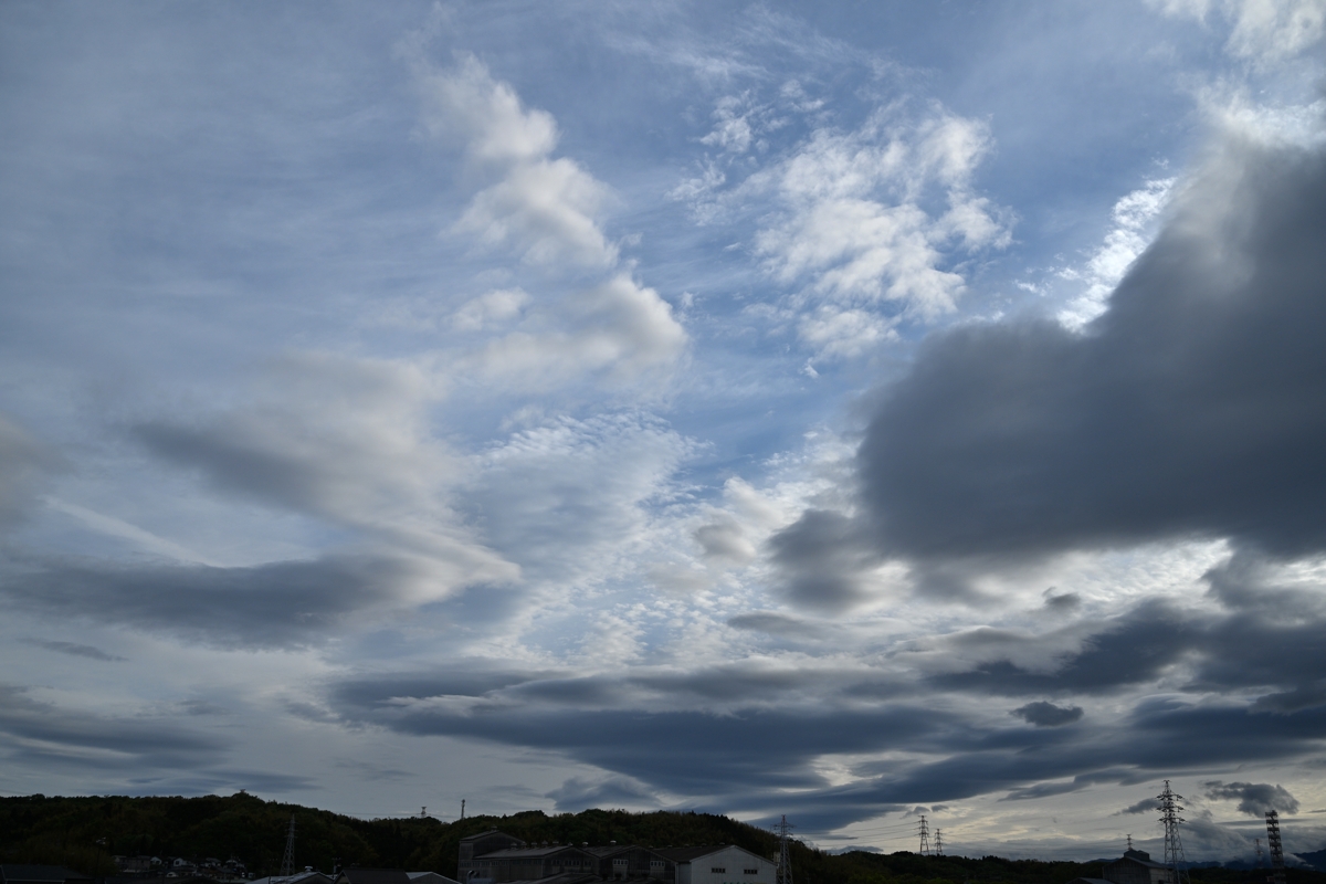 昨夜はまとまった雨。低気圧が昼前に通過。 天気はゆっくりと回復して、夕方になって層積雲が 少なくなると、たくさんの層積雲のレンズ雲が浮かぶ 空になり、しらしらと輝く高積雲も広がりました。 |
