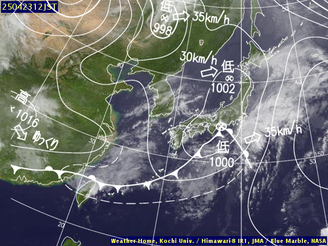 | 地上(高知大学気象情報頁赤外画像と気象庁速報天気図を合成) | |||