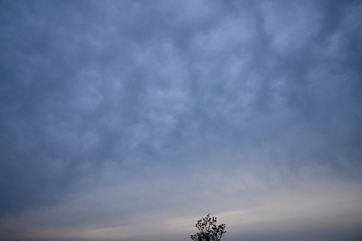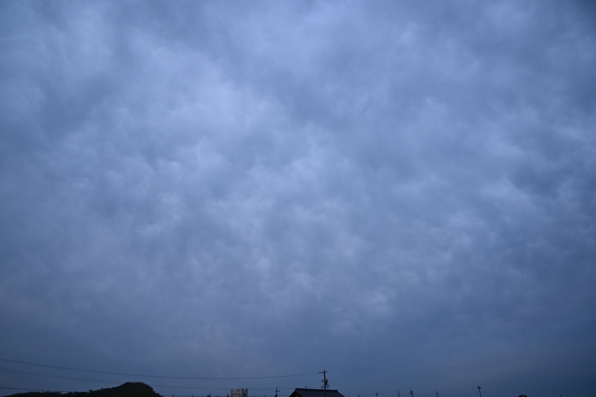 南方の停滞前線の沿って東西に長い中下層雲域がかかりました。 強い風が吹いて、空は高層雲から高めの層積雲へと変化。 日没前の層積雲の雲底は、乳房雲気味の起伏がたくさん あらわれました。 |