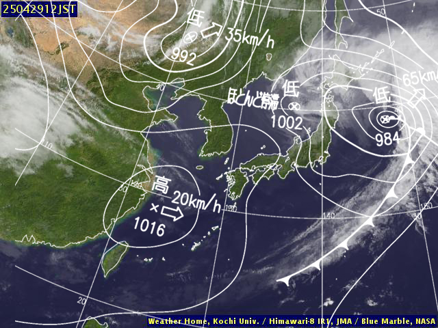 | 地上(高知大学気象情報頁赤外画像と気象庁速報天気図を合成) | |||