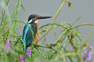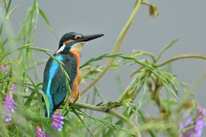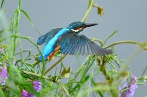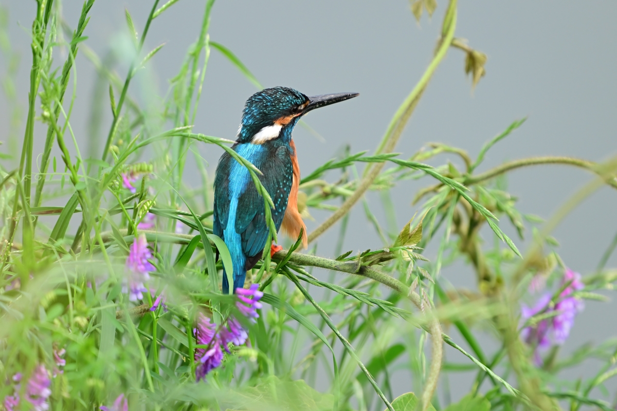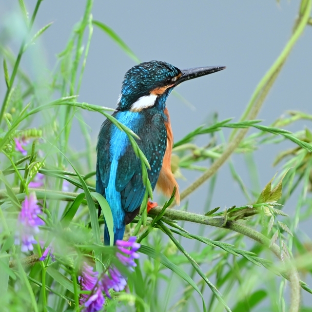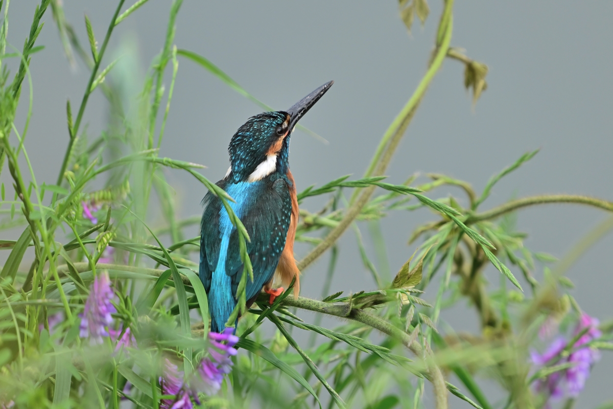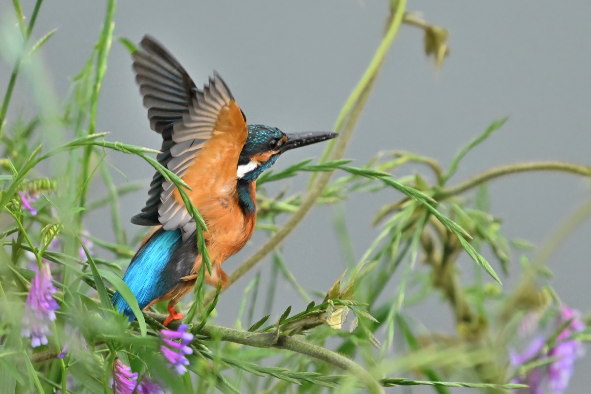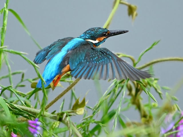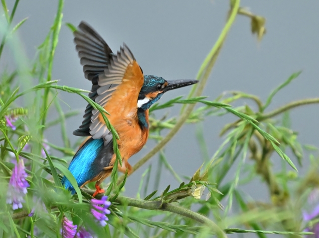 | 夕方、薄日射す曇り空のもと、員弁川にて。 昨日、対岸(南岸)の150〜200mの距離にあらわれたカワセミを あわよくば今日も狙おうと、テレコンを取り付け焦点距離800mm に準備していたところ・・・・、目前10mの岸辺にカワセミ(オス)が! 写野に導入するまで飛び立たないでくれ、と祈りながらシャッターを 切りました。季節がら岸辺には紫色のクサフジが咲き誇っており、 久しぶりのカワセミがそのまっただなかに登場してくれて、わずか 1〜2分ながら、とても美しいシーンとなりました。 飛び立ったあと、岸辺の別の場所にも留まり、この行動パターンが 明日以降も見られるかも、と思い、楽しみになりました。 |