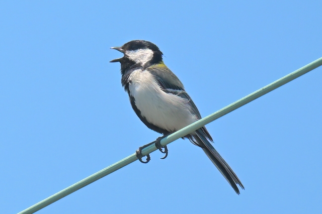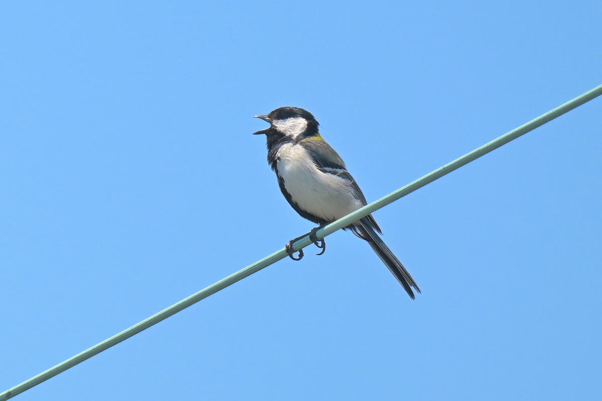 自宅の窓からみえる電線にかなり大きな声でさえずるシジュウカラ。