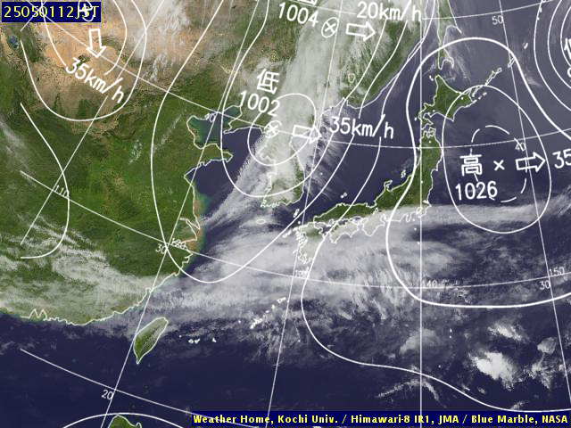 | 地上(高知大学気象情報頁赤外画像と気象庁速報天気図を合成) | |||