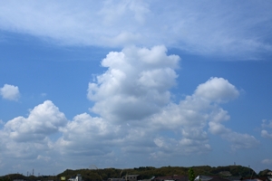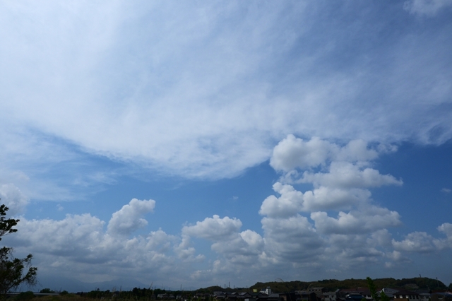 昨日南方を通過していた上層雲が、少し北上して今日も通過。 昼頃に22°ハロがあらわれましたが、ほとんどの時間はハロ の無い巻層雲でした。下層は南寄りの風が吹いて積雲が流れ 巻層雲と積雲の協演が継続しました。 |