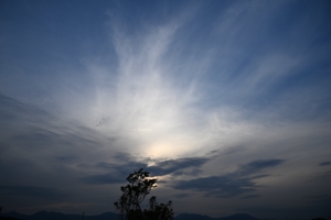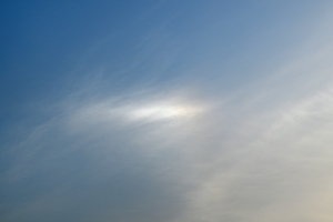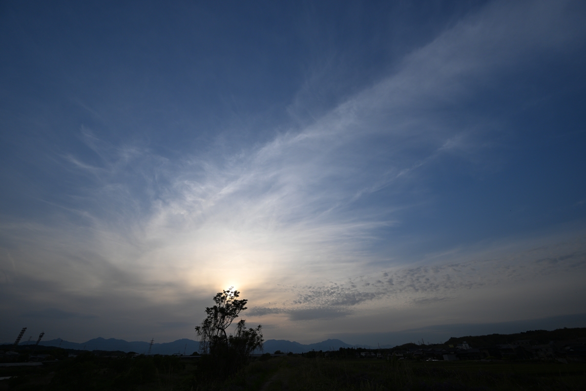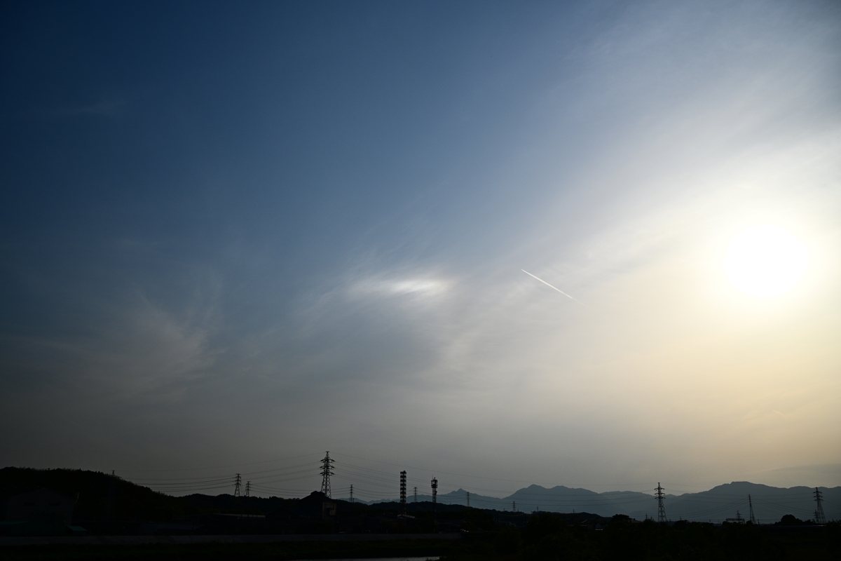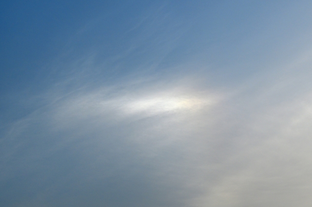 | 朝からの快晴の空。 夕方、西から巻雲・巻層雲が到来。 色の淡い幻日も見られました。 |