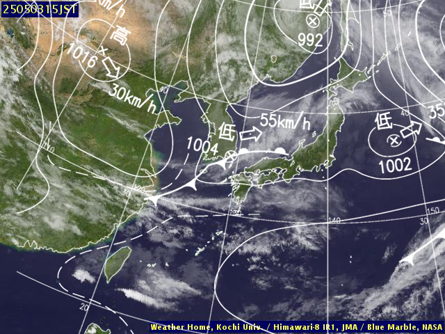 | 地上(高知大学気象情報頁赤外画像と気象庁速報天気図を合成) | |||