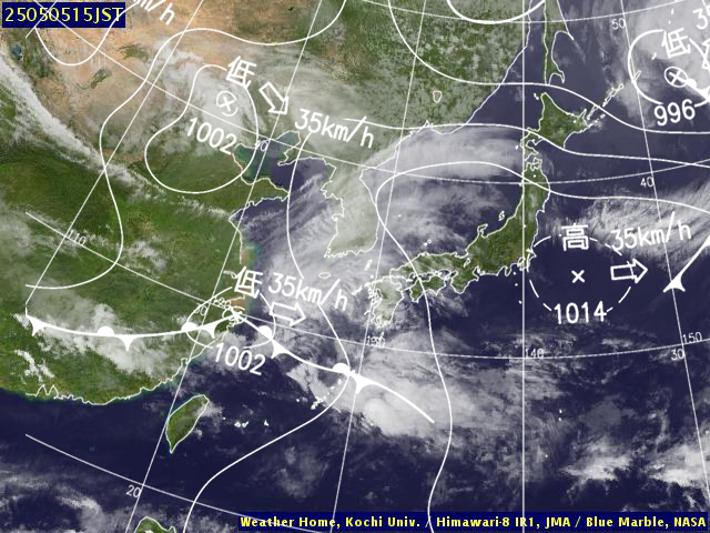| 地上(高知大学気象情報頁赤外画像と気象庁速報天気図を合成) | |||