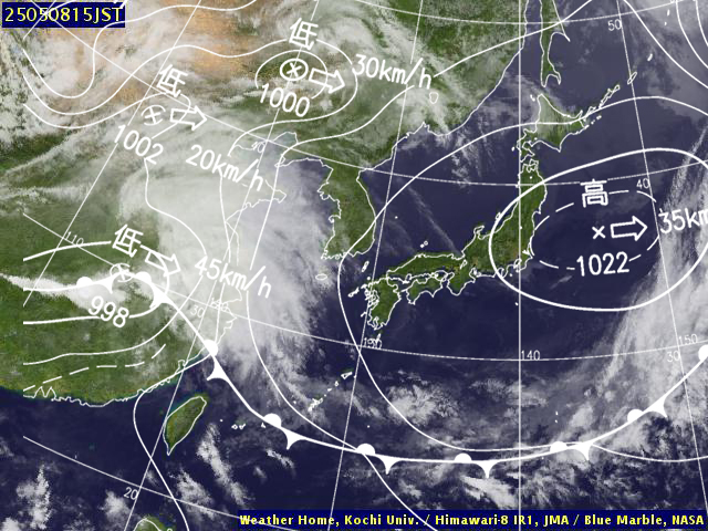 | 地上(高知大学気象情報頁赤外画像と気象庁速報天気図を合成) | |||