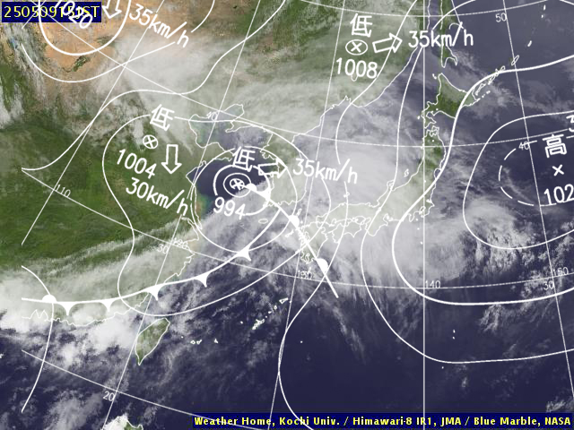 (高知大学気象情報頁赤外画像と気象庁速報天気図を合成)