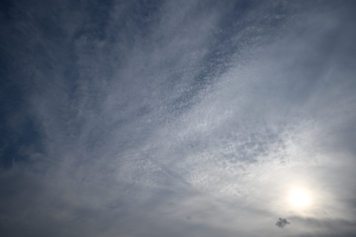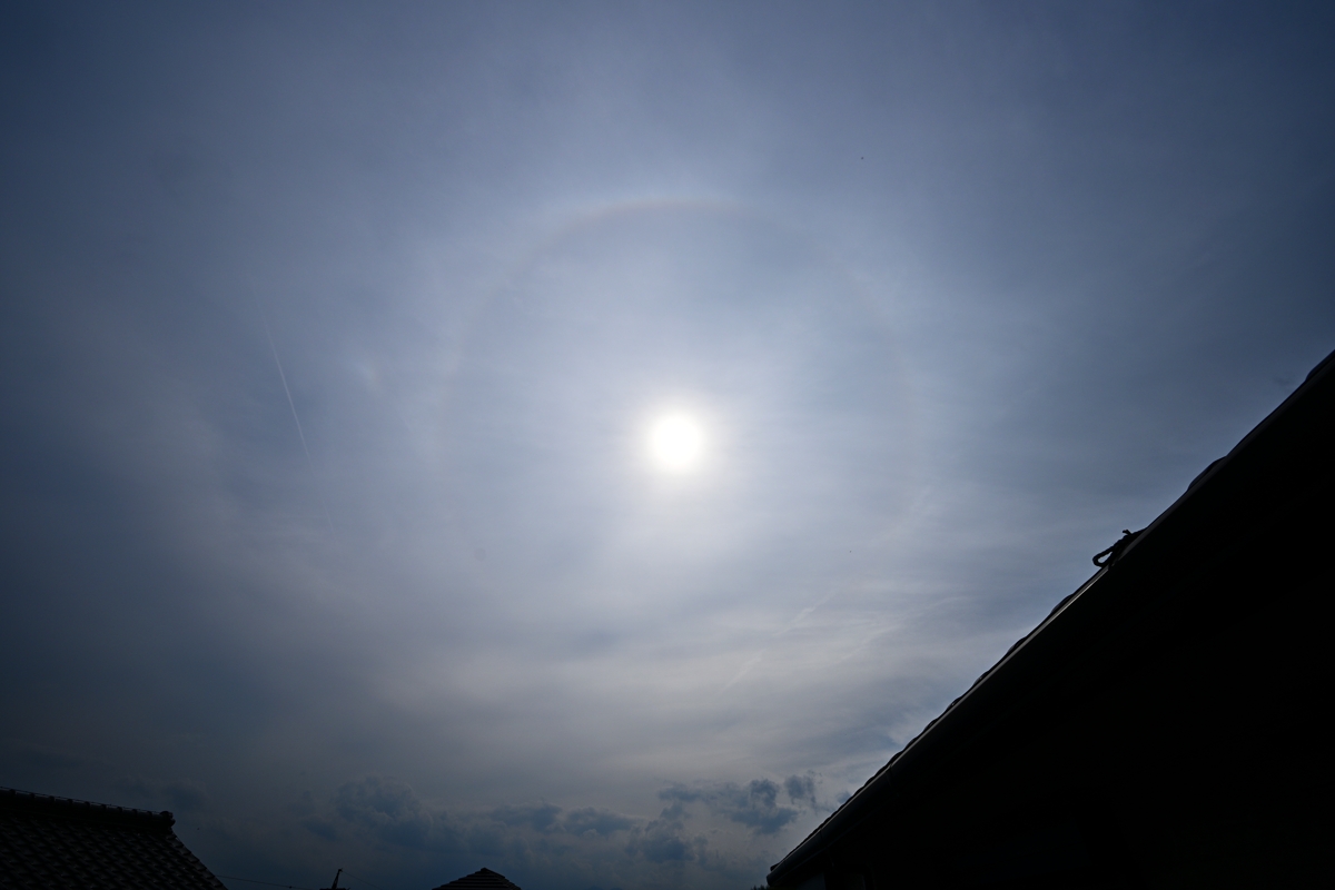 「南シナ海」から「日本の東」にかけて、とても長い停滞前線 (梅雨前線)が生じていて、今週の後半には雨模様の天気に なりそうな予報です。 「春ははろの季節」と言われますが、今年の春はすっきりした 鮮明なハロが少なく、残念に思っていたところ、今日はもう 早くも、梅雨前線に伴うタイプのハロが登場しました。 前線に伴う高層雲の北縁が北の空に見える空で、高層雲に近い ような巻層雲に22°ハロ、幻日、タンジェントアークが見られました。 |
