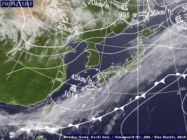 | 地上(高知大学気象情報頁赤外画像と気象庁速報天気図を合成) | |||