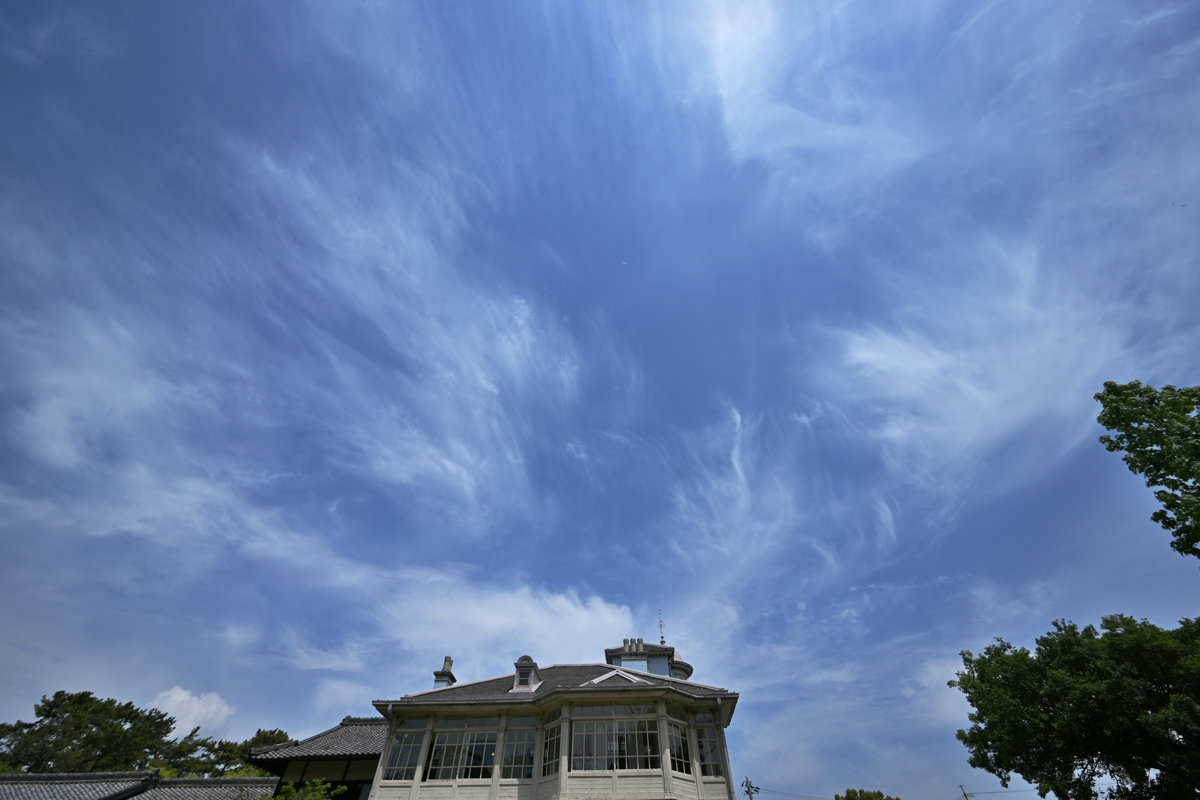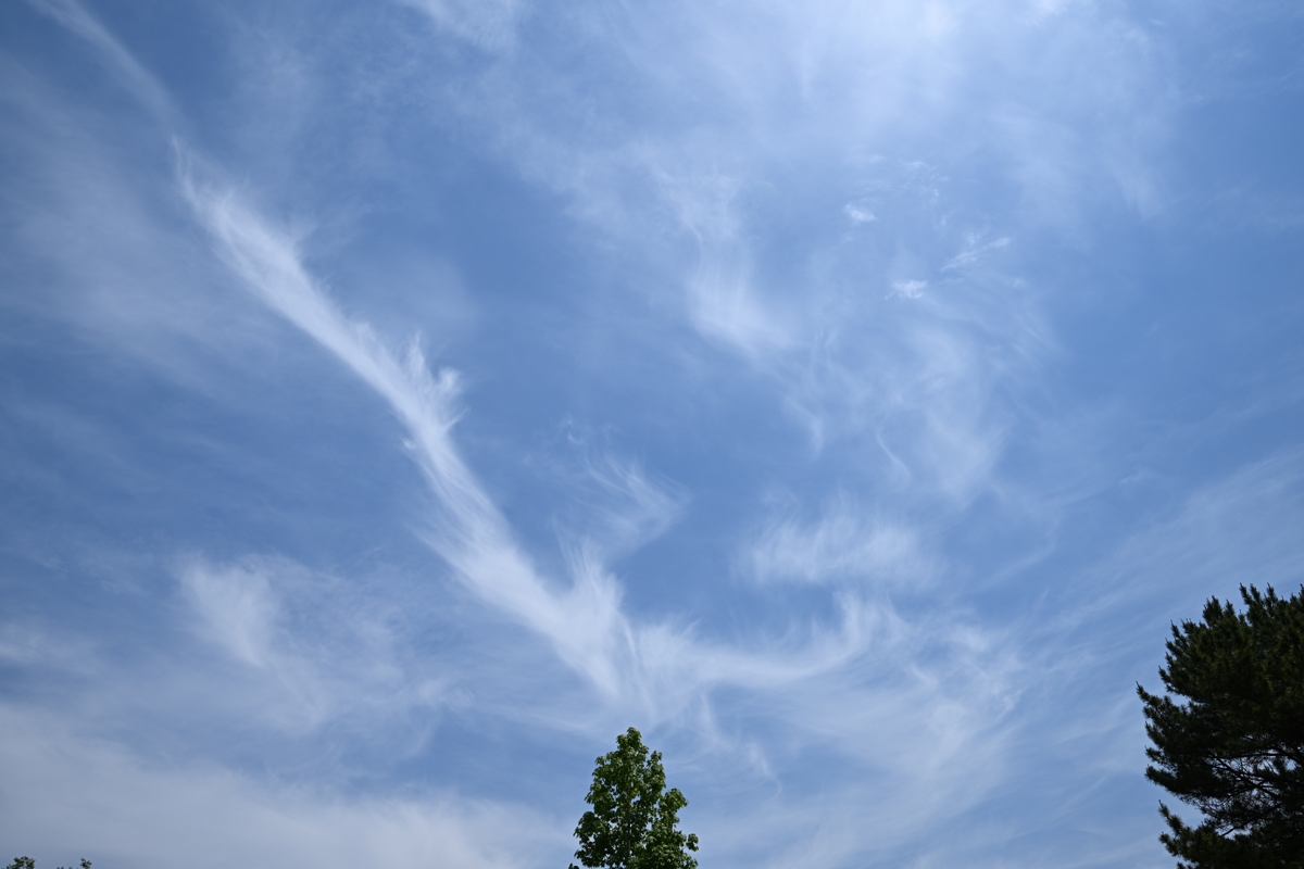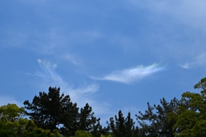 | 日本海から南岸にかけての広い幅をもつ上層雲域が東西に 延びていて、衛星画像ではその分布の斑さが顕著です。 実際の空でも、一様な巻層雲よりも巻雲の集合体のよう。 午後は高層雲がまざってきて、夕方には高層雲のない 巻層雲の部分にときどき幻日が見られました。 |