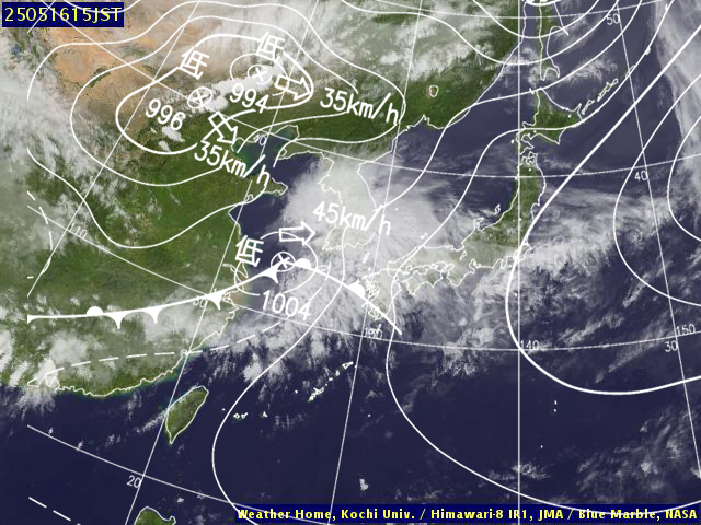 | 地上(高知大学気象情報頁赤外画像と気象庁速報天気図を合成) | |||