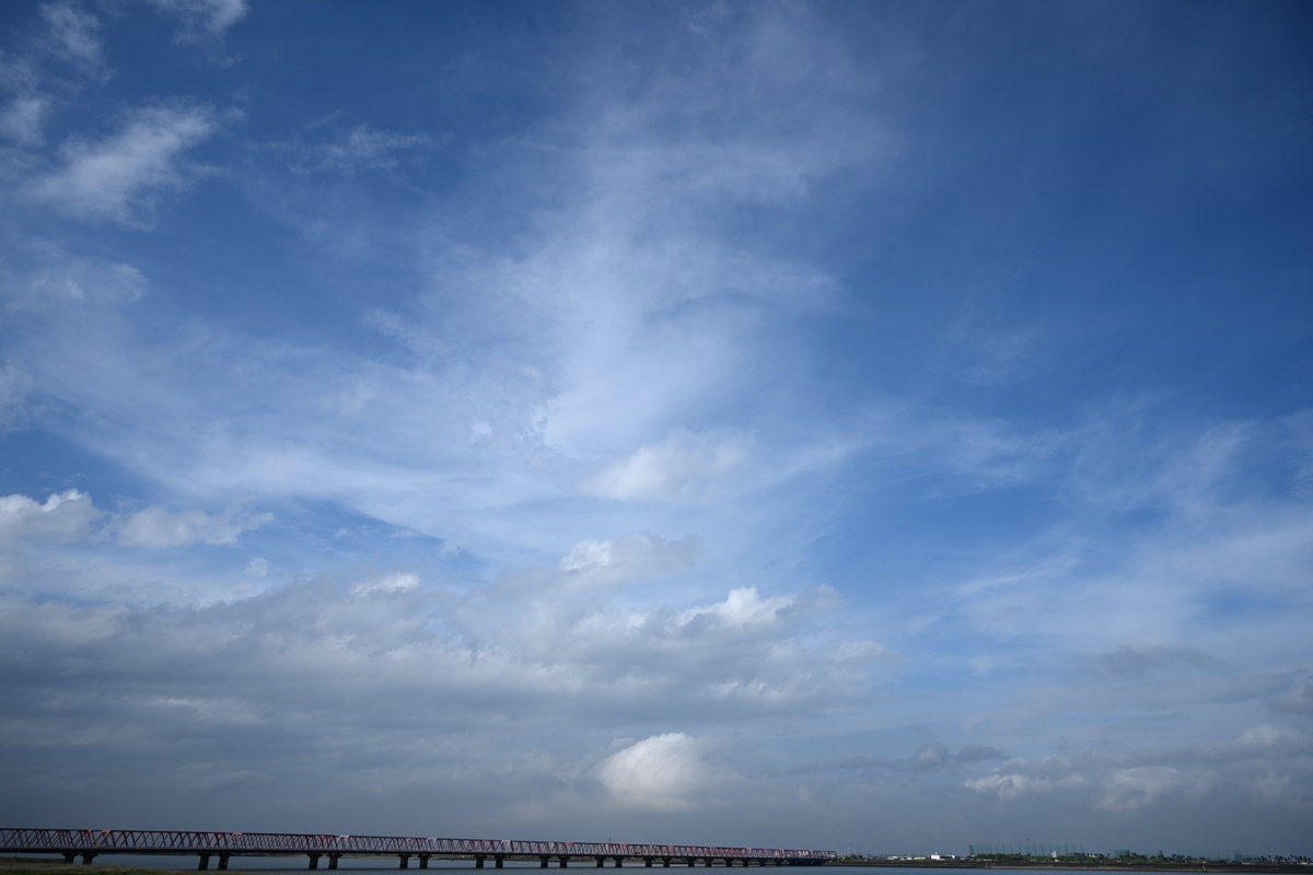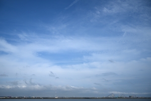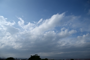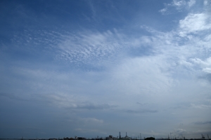 北日本に向かって日本海を低気圧が通過。 寒冷前線が通過して、愛知県三河方面などで 雷雨。三重県北部は雨のみでした。 夕方、青空の見え始めた空には、下層に 層積雲、上層に巻層雲などがあらわれました。。 |