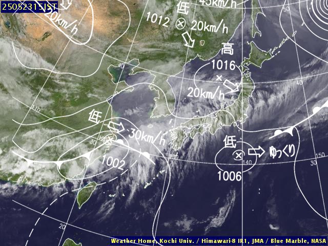 | 地上(高知大学気象情報頁赤外画像と気象庁速報天気図を合成) | |||