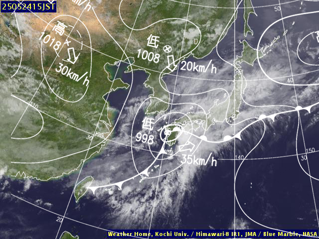| 地上(高知大学気象情報頁赤外画像と気象庁速報天気図を合成) | |||