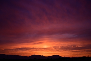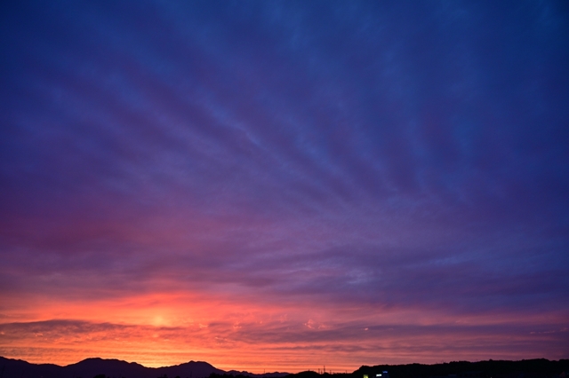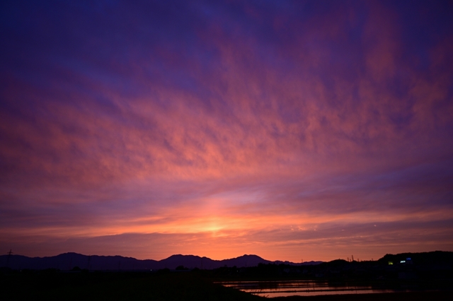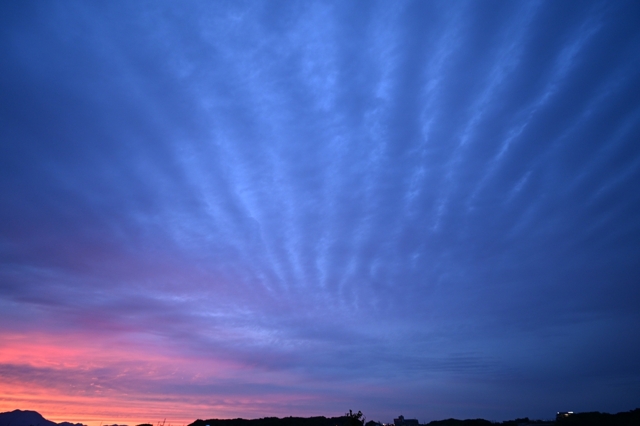 沖縄の南から千島近海までつづく停滞前線に沿って、 幅の広い雲域が本州全体にかかりました。 三重県北部もこの雲におおわれて、高層雲や層積雲。 夕方、波状雲がたくさんあらわれるようになって、 短い尾流雲も混ざる空。そのまま日没になって、 西からさしこむ陽光がとどいていたので夕焼けを じっと待って・・・・。そして日没(18:59)から数分後、 期待以上の素晴らしい夕焼け! 太陽柱も混ざり、 さらには全天に青みを帯びた波状雲も広がりました。 |