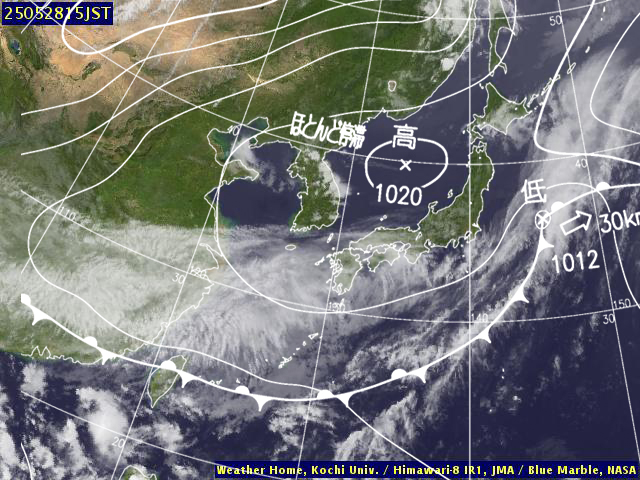 | 地上(高知大学気象情報頁赤外画像と気象庁速報天気図を合成) | |||