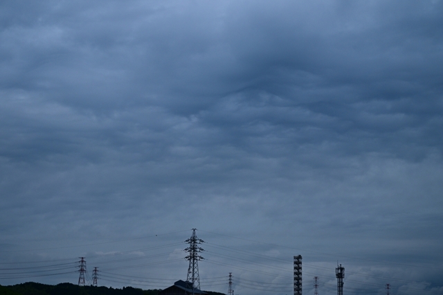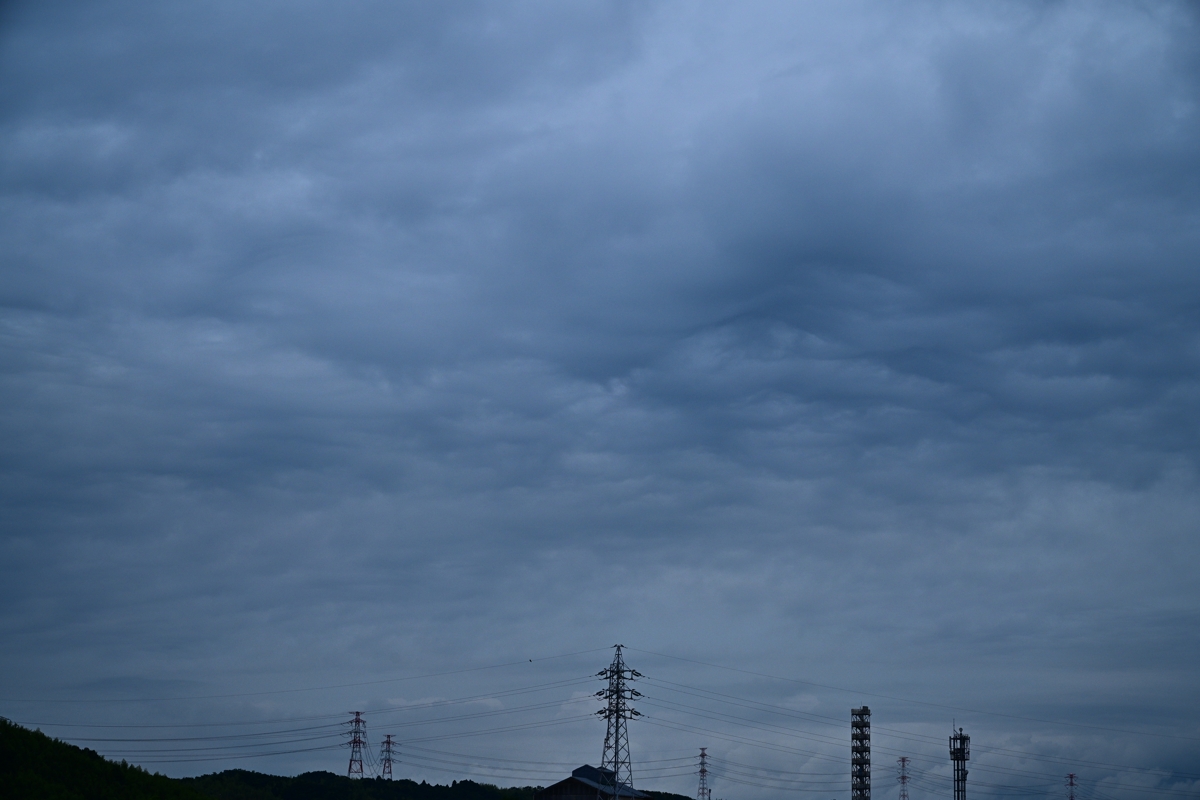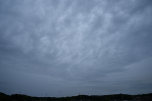 梅雨入りはまだながら、南岸にいすわる停滞前線に伴う 雲域がかかりつづけて曇り空がつづいています。 高層雲が主体の空に、夕方、浮かびだすように層積雲が うまれ、部分的に荒底雲もあらわれたりしました。 |