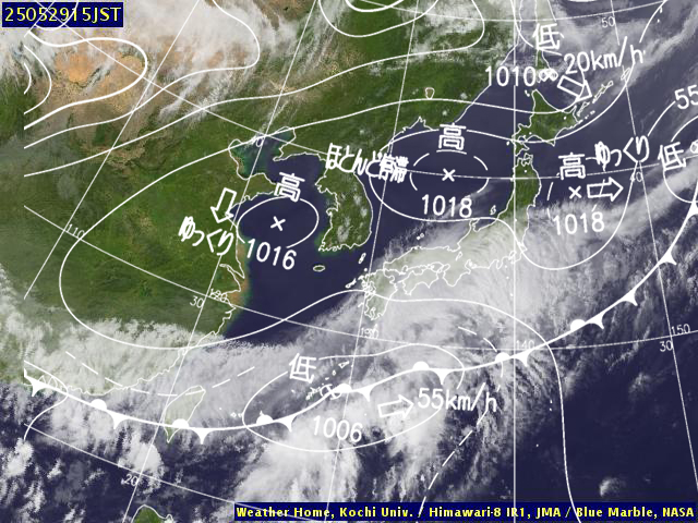 | 地上(高知大学気象情報頁赤外画像と気象庁速報天気図を合成) | |||