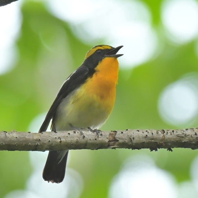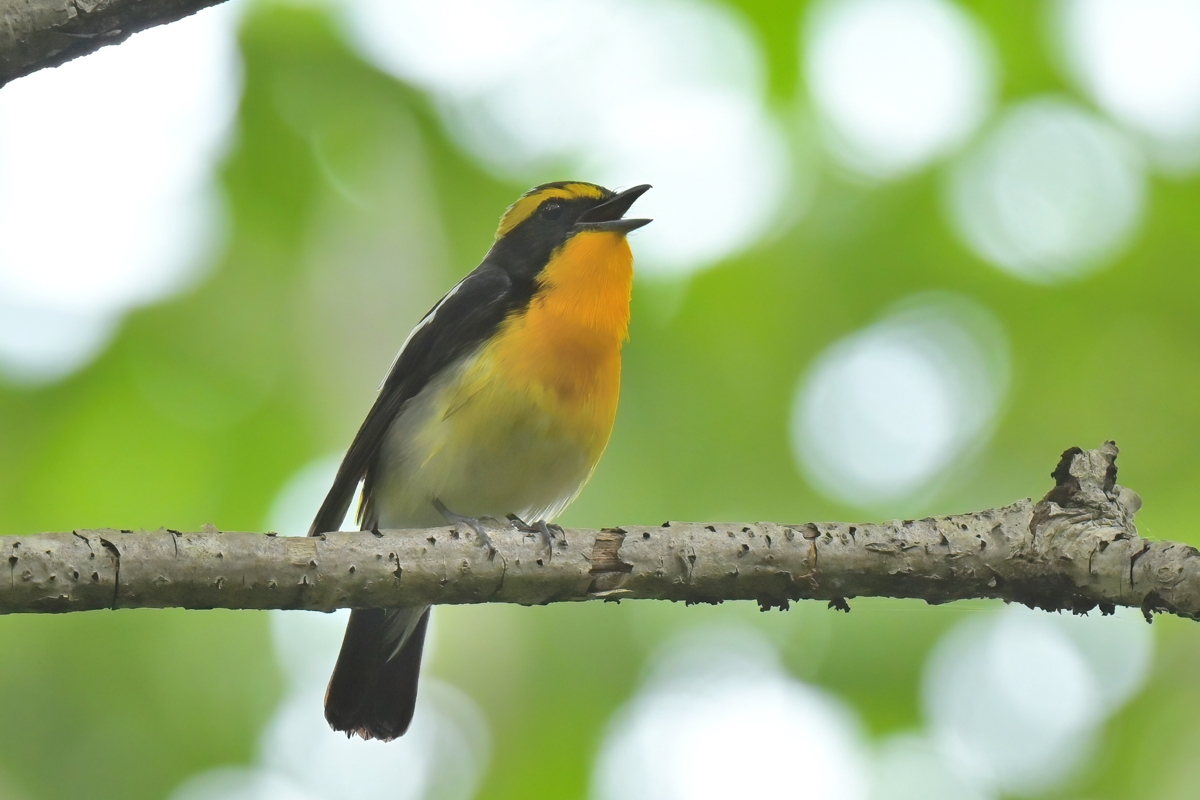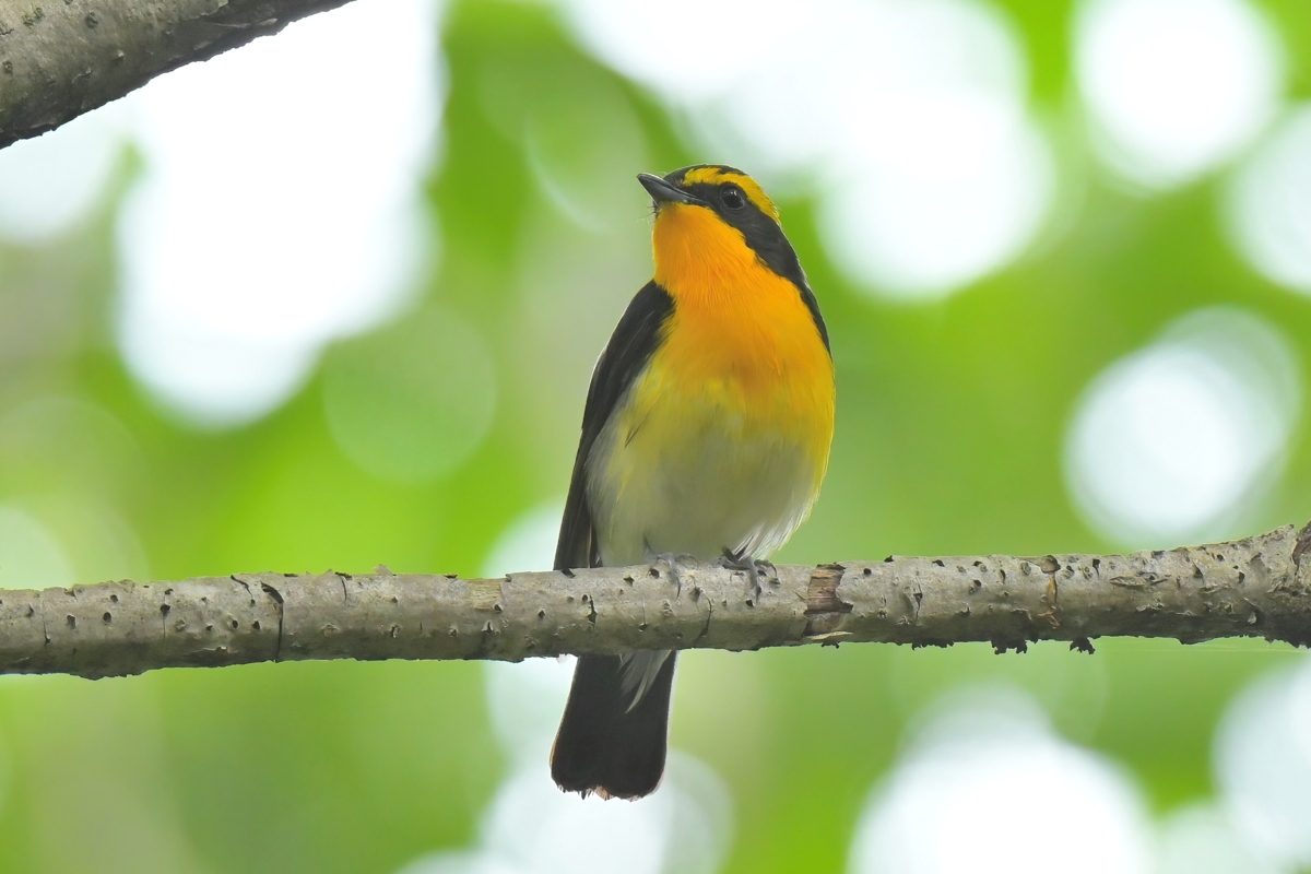 | 菰野町の森林にて。 あちらこちらでキビタキの美しく大きな声が響き渡っています。 2〜3個体が近くにいて囀りあっているシーンもありました。 ただ、樹木がよく茂っていて、なかなか姿を見つけられず、 場所を変えながらずいぶん粘ってようやく撮影したカットです。 |