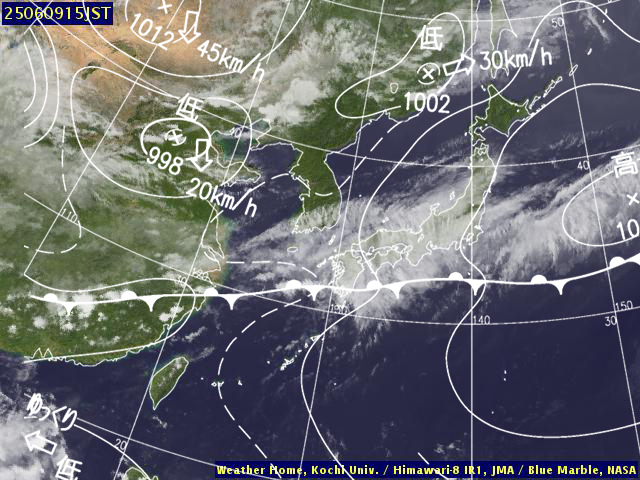 (高知大学気象情報頁赤外画像と気象庁速報天気図を合成)