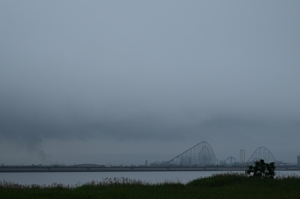 乱層雲の雲底が地上近くにまで迫り、工場等からの
