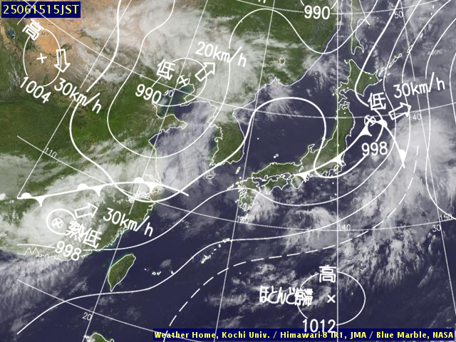 | 地上(高知大学気象情報頁赤外画像と気象庁速報天気図を合成) | |||
