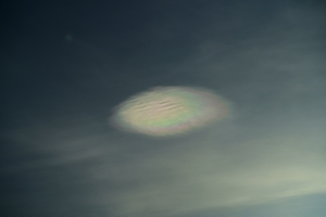 | 太陽近傍のレンズ雲に彩雲 18:07 西 200mm |