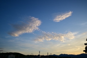 | 低気圧は三陸沖にぬけて、ポテンシャルの小さい寒冷前線が通過。 三重県北部ではアメダスに記録されない程度の小雨が降るのみでし たが、九州では暖湿流が入って強い雨の所もありました。 夕方は西風が卓越して、下層から上層まで、あちらこちらにつるし雲 やレンズ雲などの地形性の雲が生じる空になりました。 |
