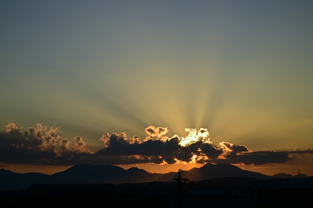 日中は積雲の多い空でしたが、夕方に消えてゆき、すばらしい夕陽の光芒。