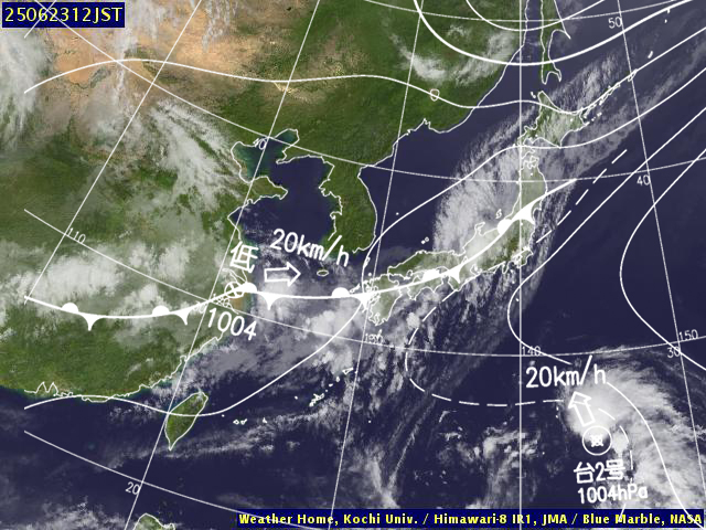| 地上(高知大学気象情報頁赤外画像と気象庁速報天気図を合成) | |||