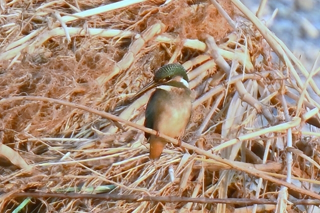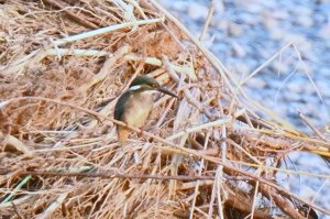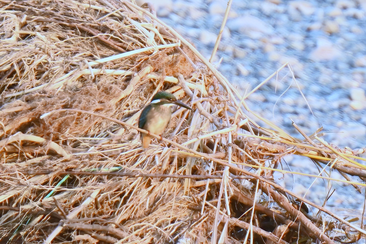 夕方、西日が強烈な員弁川。対岸の漂着物に留まるカワセミ。