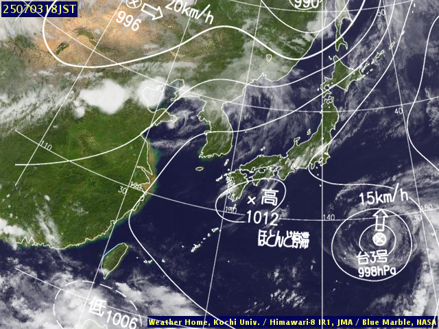 (高知大学気象情報頁赤外画像と気象庁速報天気図を合成)