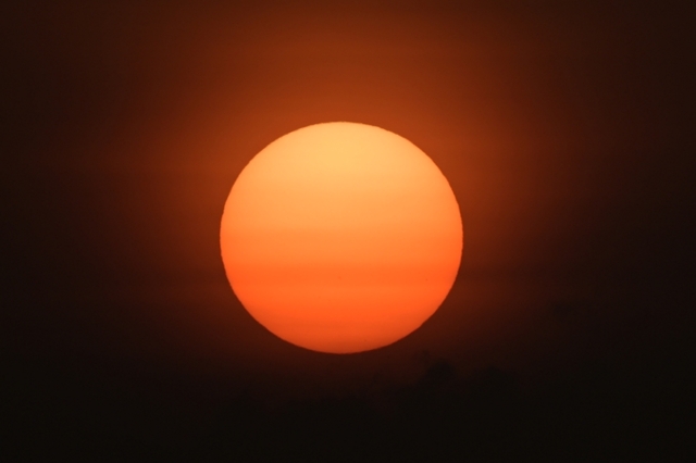 透明度が低い空で、日没直前の夕陽は大きく減光を受けており、