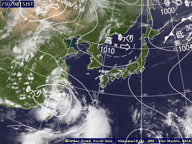 | 地上(高知大学気象情報頁赤外画像と気象庁速報天気図を合成) | |||