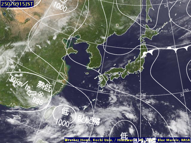 | 地上(高知大学気象情報頁赤外画像と気象庁速報天気図を合成) | |||