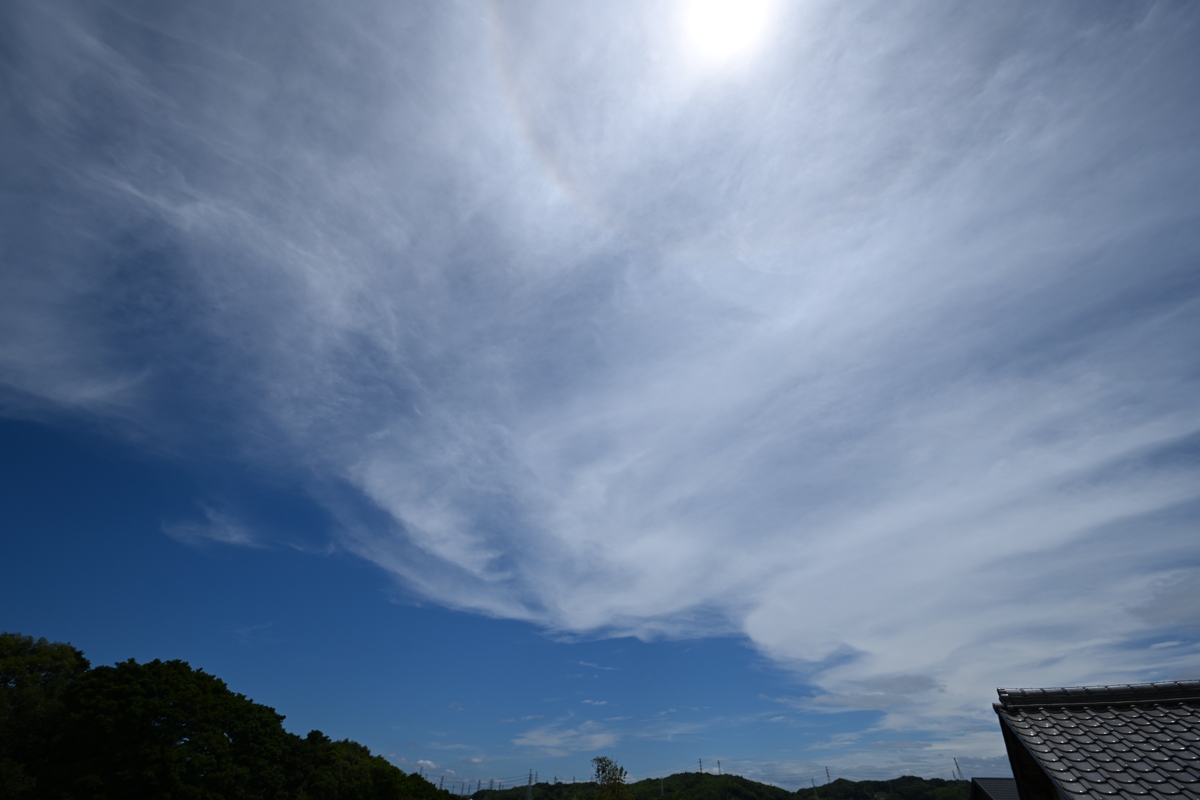 台風5号は三陸沖、熱帯低気圧から変わった温帯低気圧は 日本海に。低気圧の接近の影響で、昼頃はシルクのような 美しい巻層雲が広がってきて22°ハロが見らる空。 そして夕方からはときおり驟雨が始まりました。 東海地方には線状降水帯の発生する可能性があり、 注意が呼びかけられています。 |