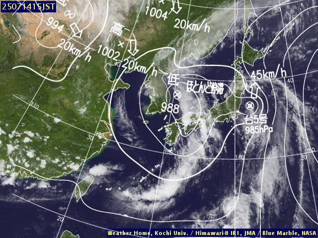 | 地上(高知大学気象情報頁赤外画像と気象庁速報天気図を合成) | |||