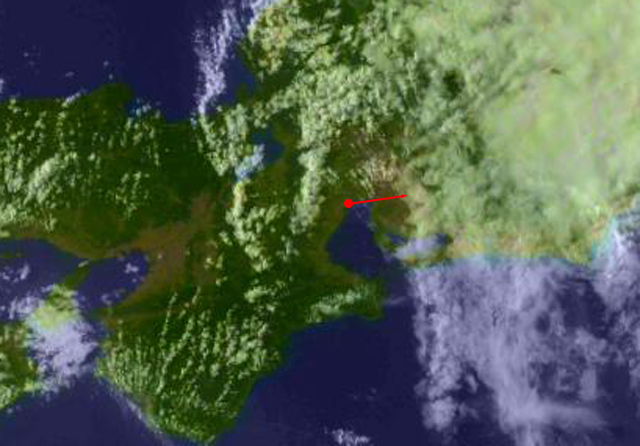 | 地上(高知大学気象情報頁赤外画像と気象庁速報天気図を合成) | |||