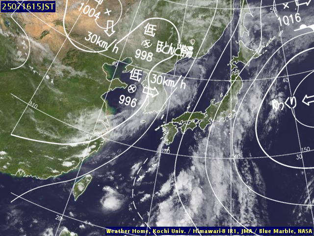 | 地上(高知大学気象情報頁赤外画像と気象庁速報天気図を合成) | |||