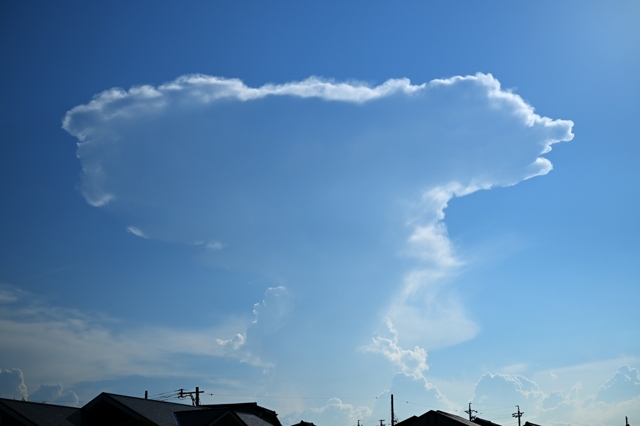 今日は積乱雲ラッシュ。 北東の積乱雲が小さく見えたのは、いつもの東濃方面ではなく、 さらに遠方で発達した飛騨〜信州方面の積乱雲群でした。 そして、南西の空には遠方に巨大なかなとこ雲と近傍の積乱雲。 紀伊半島の山地全体を覆うような積乱雲とかなとこ雲でした。 |