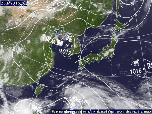 | 地上(高知大学気象情報頁赤外画像と気象庁速報天気図を合成) | |||