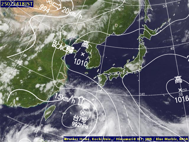 | 地上(高知大学気象情報頁赤外画像と気象庁速報天気図を合成) 18時 | |||