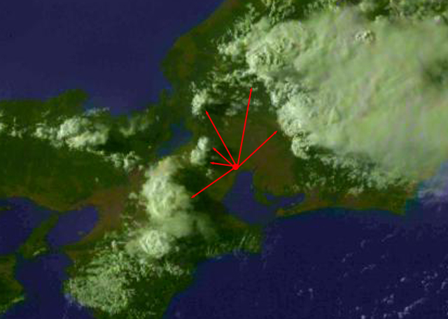 連日、最高気温(桑名)は34℃台。空も連日、南〜南東方向を のぞいて、積乱雲とかなとこ雲の群れ。昨日と同じような場所に これらの雲が発達し、まるで前日の再現を見ているような空です。 鈴鹿山脈にも昨日と同様の積乱雲・かなとこ雲。 かなとこ雲に鮮やかな幻日も出現しました。 |