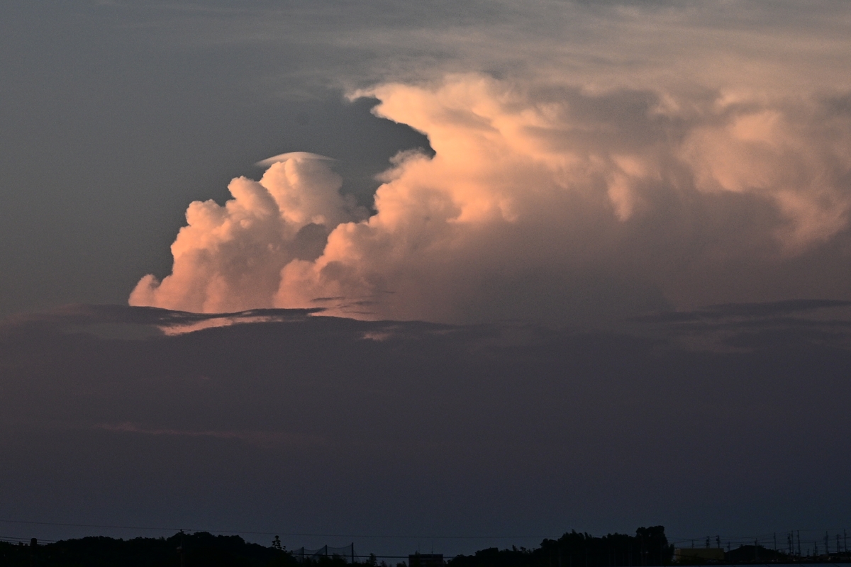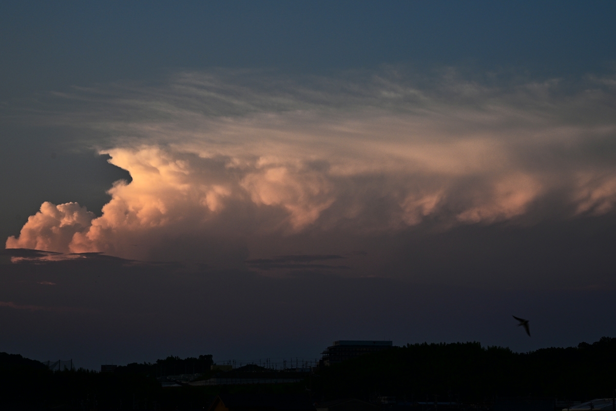 台風が気になりますが、基本的に高気圧の勢力圏。 強い日射で、最高気温(桑名)は37.5℃の猛暑日。 大気の状態は広く安定化していて、積乱雲も低調。 それでも夕方になると、北北東の空(郡上・下呂方面) に2つの積乱雲がもくもくと発達してゆくのが見えました。 日没後は、一体化したかなとこ雲が夕焼けに染まりました。 |